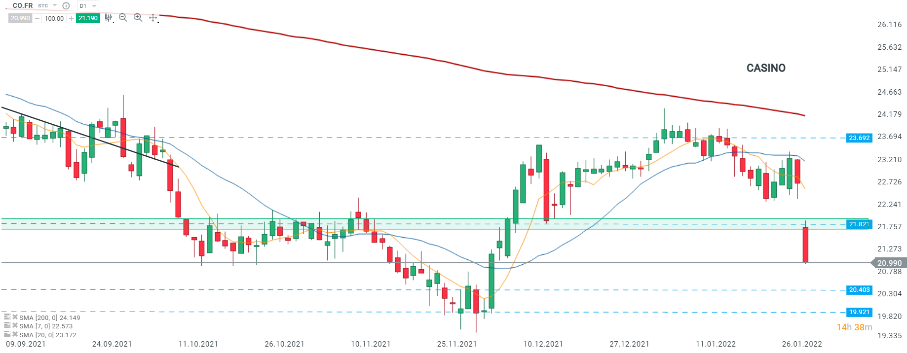 Les cours de Casino (CO.FR) ont ouvert avec un important gap baissier, cassant la résistance majeure à 21,821. Au moment de la rédaction de ces lignes, les cours se dirigent vers le support à 20,403, dernier rempart avant les plus bas historiques du groupe de distribution française dans la zone des 19,468. Toutefois, si les acheteurs prennent le contrôle, la résistance susmentionnée serait à envisager. Source : xStation5