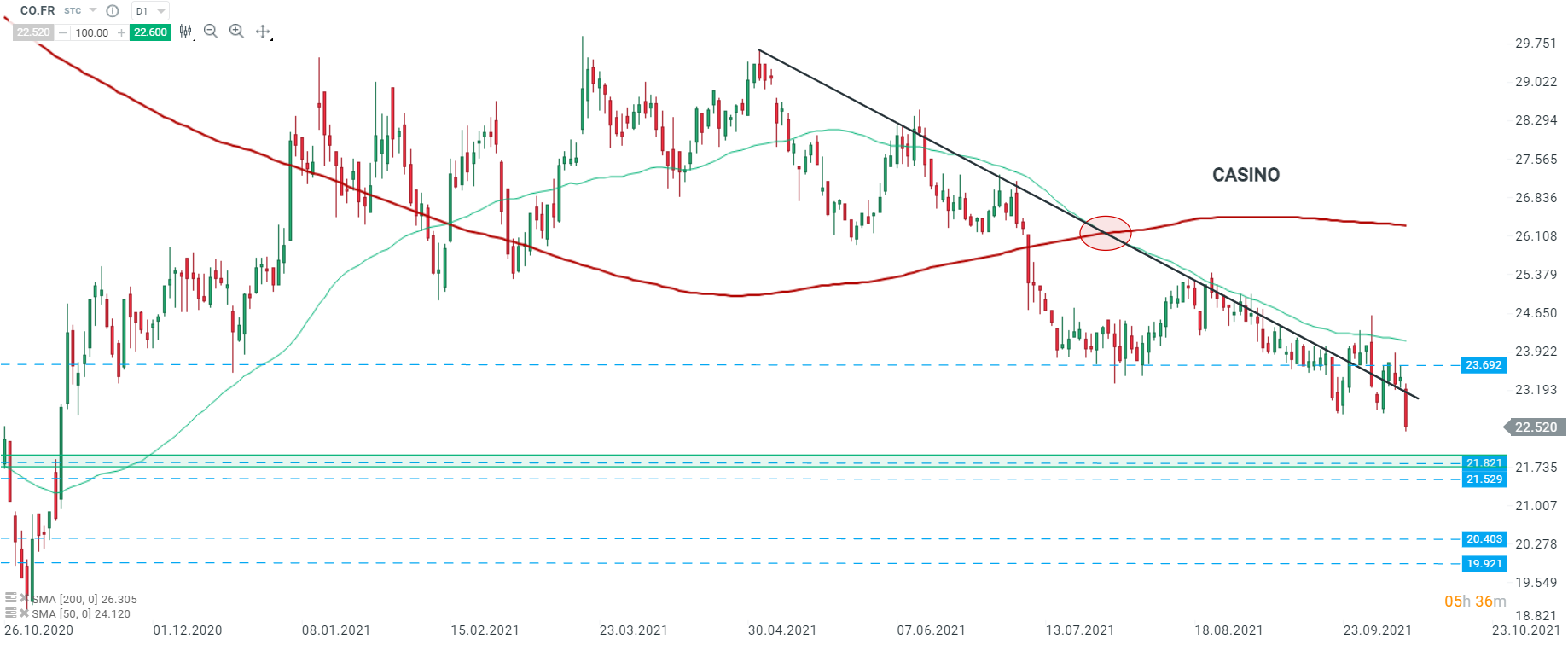 Les cours de Casino (CO.FR) ont plongé ce matin, franchissant à la baisse l’oblique baissière faisant office de résistance. La nouvelle du report de l’augmentation de capital ayant altéré le sentiment du marché. Au moment de la rédaction de ces lignes, les cours se dirigent vers la zone de support à 21,821. Toutefois, si l’humeur venait à s’améliorer et que les acheteurs prennent le contrôle, la résistance à 23,692 constitue la prochaine cible. Source : xStation5