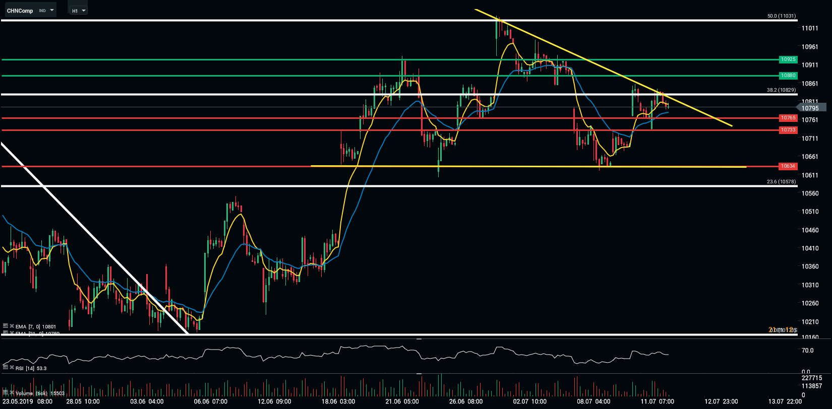 Après un plusieurs séance de baisse, CHNcomp est parvenu à rebondir sur la zone des 10 634 points. Les haussiers « calent » au niveau des 10 861 points (38,2 % des retracements de Fibonacci). Après les deux échecs au seuil précédemment mentionné, les vendeurs essayent de ramener les cours vers les 10 765 points. Le dossier commercial permettra aux spéculateurs de voir plus clair.