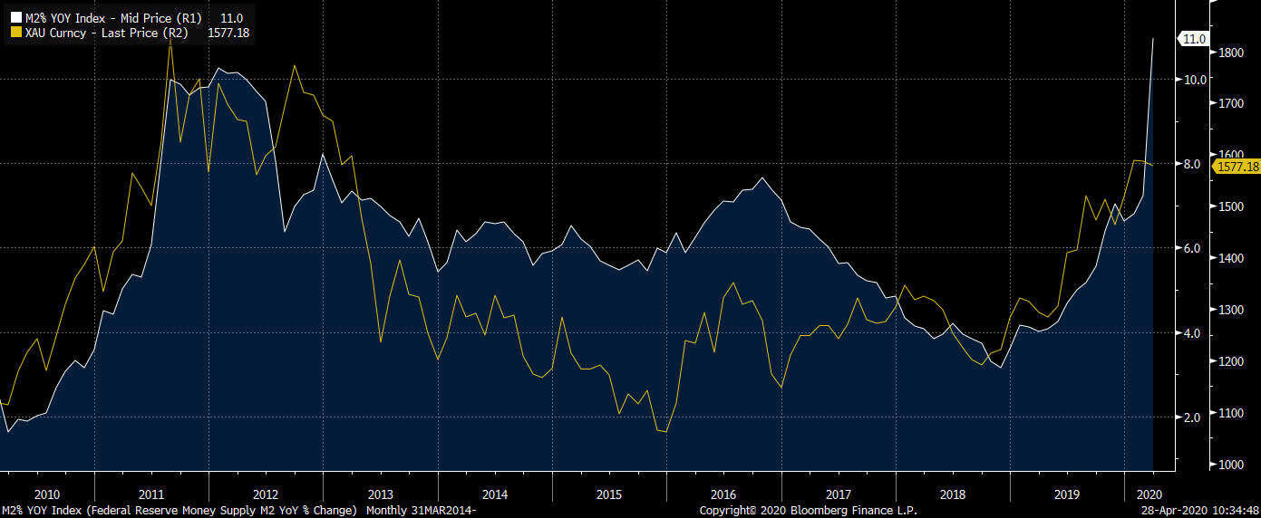 Forte augmentation de la masse monétaire. La dernière fois que la masse monétaire a augmenté de plus de 11% en glissement annuel dans les années 80. On prévoit que cette croissance dépassera 20% en termes annuels dans les prochains mois. La situation devrait soutenir les cours de l'or. Source: Bloomberg