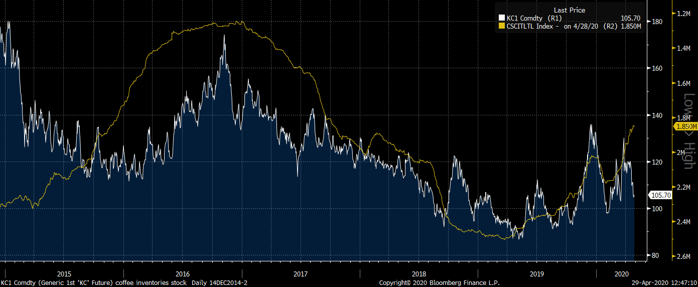 Les stocks de café continuent de baisser, ce qui peut être expliqué par des cours record au Brésil. Les stocks sont vendus pour bloquer des cours élevés. Source: Bloomberg