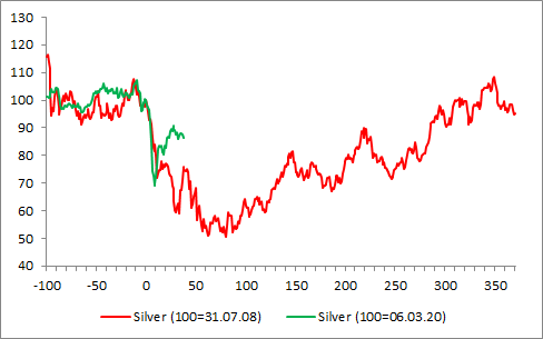 Parallèlement à 2008, le bas du marché de l'argent pourrait être encore devant nous. Il devrait être atteint dans les 90 jours suivant la première grande baisse. En revanche, les banques centrales ont réagi plus rapidement que les fois précédentes.