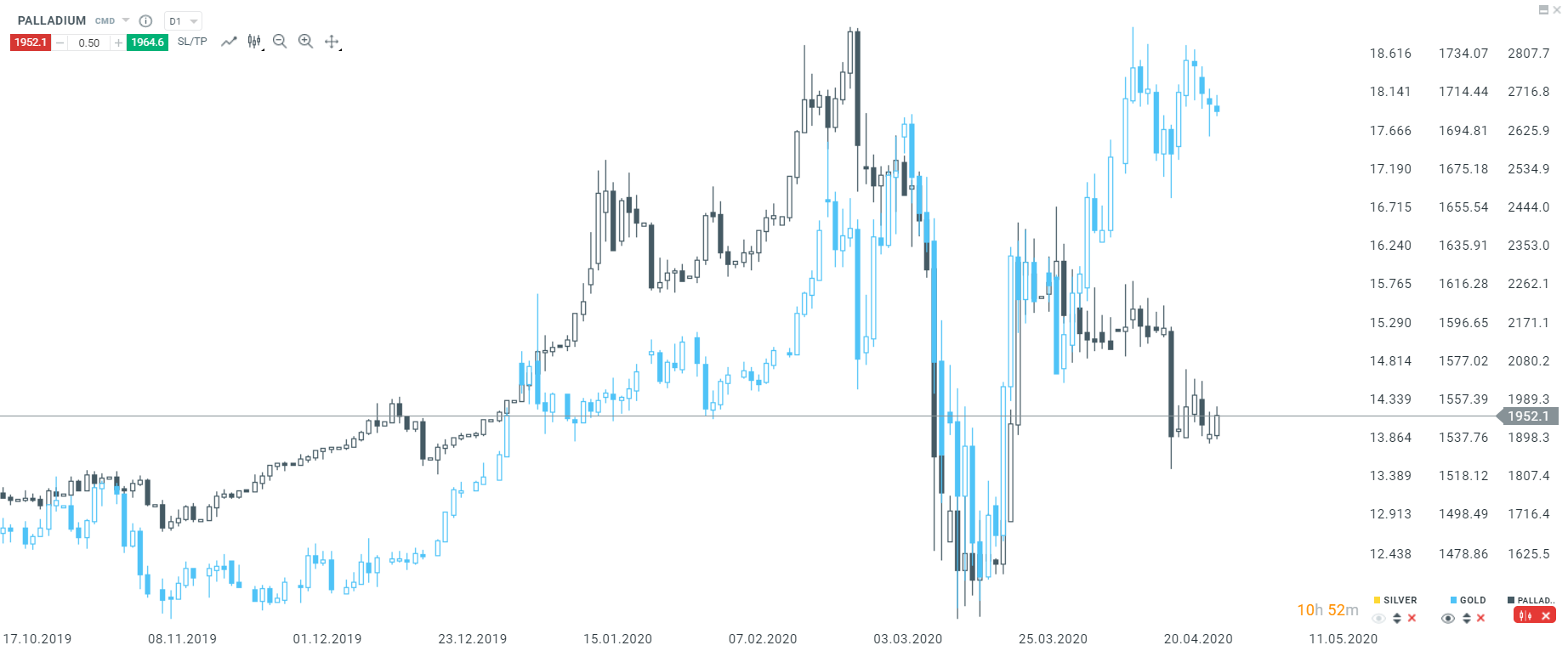 Il existe une divergence importante entre les cours de l'or et du palladium. Source: xStation5