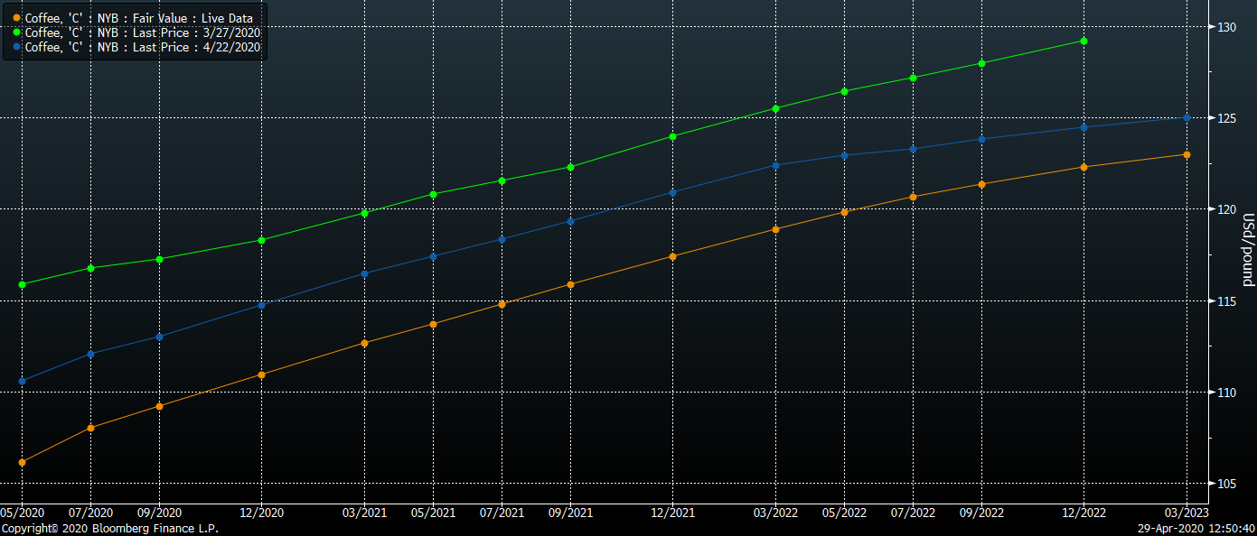La courbe des contrats à terme pour le café indique une attente d'une offre importante. Source: Bloomberg