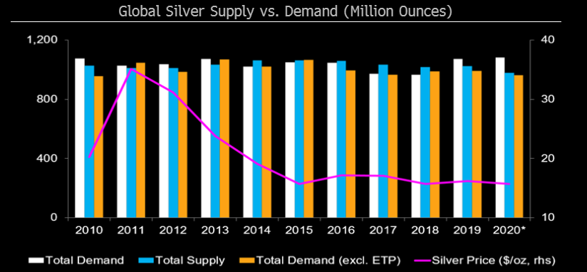 Augmentation significative de la demande d'ETF et offre limitée. Un effet de rareté sur le marché de l'argent est attendu pour la deuxième année consécutive. Cela pourrait conduire à une augmentation des cours à moyen et long terme. Source: Bloomberg
