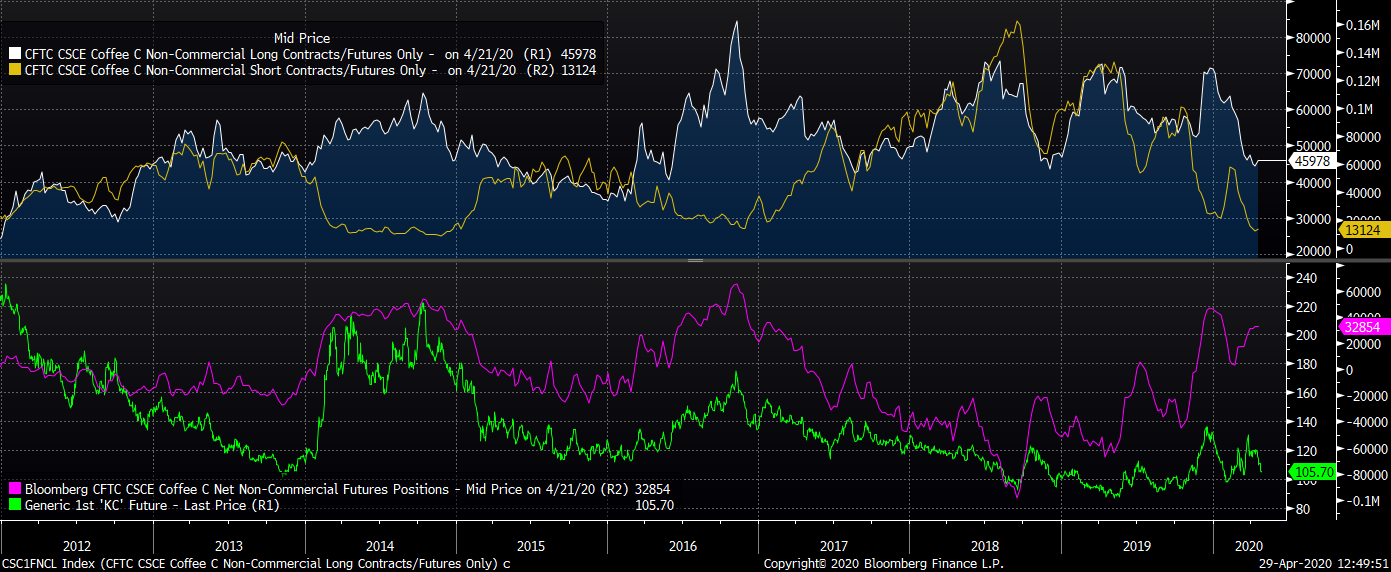 Le nombre de "positions courtes ouvertes" sur le café est extrêmement faible. En revanche, ce n'est pas un signal de vente fort car le nombre de positions longues a également sensiblement baissé. Source: Bloomberg