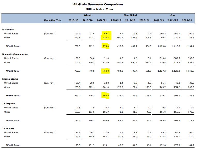 Le dernier rapport WASDE montre qu'il existe toujours une forte surproduction sur le marché mondial du blé. Source : USDA