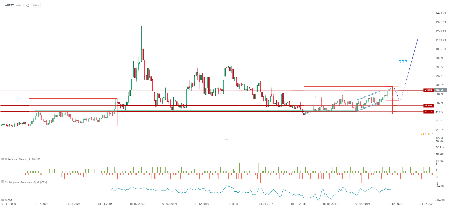 Le cours du blé se consolide. On observe encore une nette similitude avec la période 2006. En revanche, les années 2009-2010 montrent que les prix de l'ordre de 650 cents le boisseau pourraient rapidement tomber à environ 420 cents le boisseau. Beaucoup dépendra des coûts et d'autres facteurs de la demande. Source : xStation5