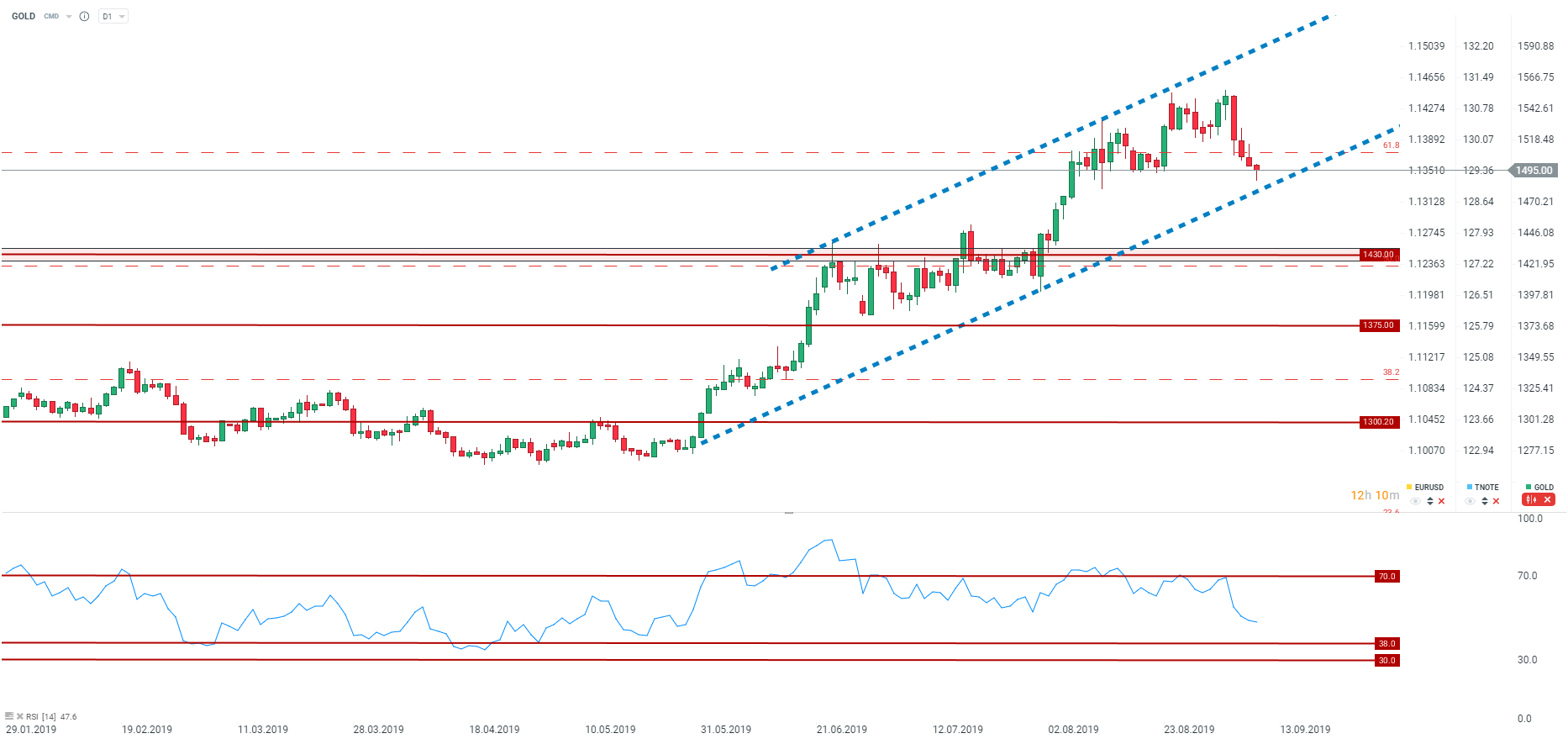 Le prix de l'or ne cesse de reculer par rapport à son apogée suite à un meilleur sentiment du marché. Source: xStation5