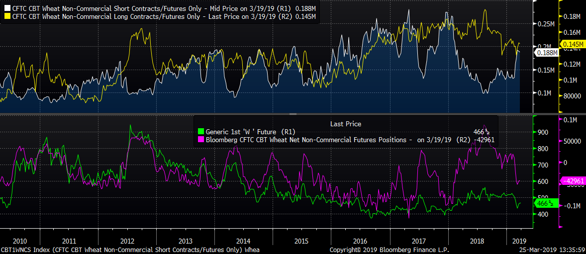 Une opportunité d'achat pourrait avoir lieu dans le blé basée sur le positionnement net. Source: Bloomberg