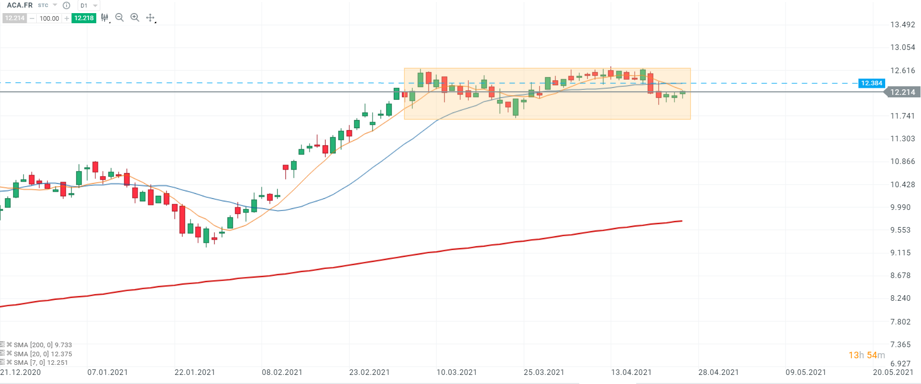 Le succès de l’OPA a fait grimper le titre Crédit Agricole (ACA.FR). Les cours se dirigent vers la SMA 20 (ligne bleue) à 12,384 au moment de la rédaction de ces lignes. Si le sentiment actuel prévaut et que les cours parviennent à franchir le niveau mentionné ci-dessus, le mouvement haussier pourrait s’étendre jusqu’à la borne supérieure du range. Source : xStation5