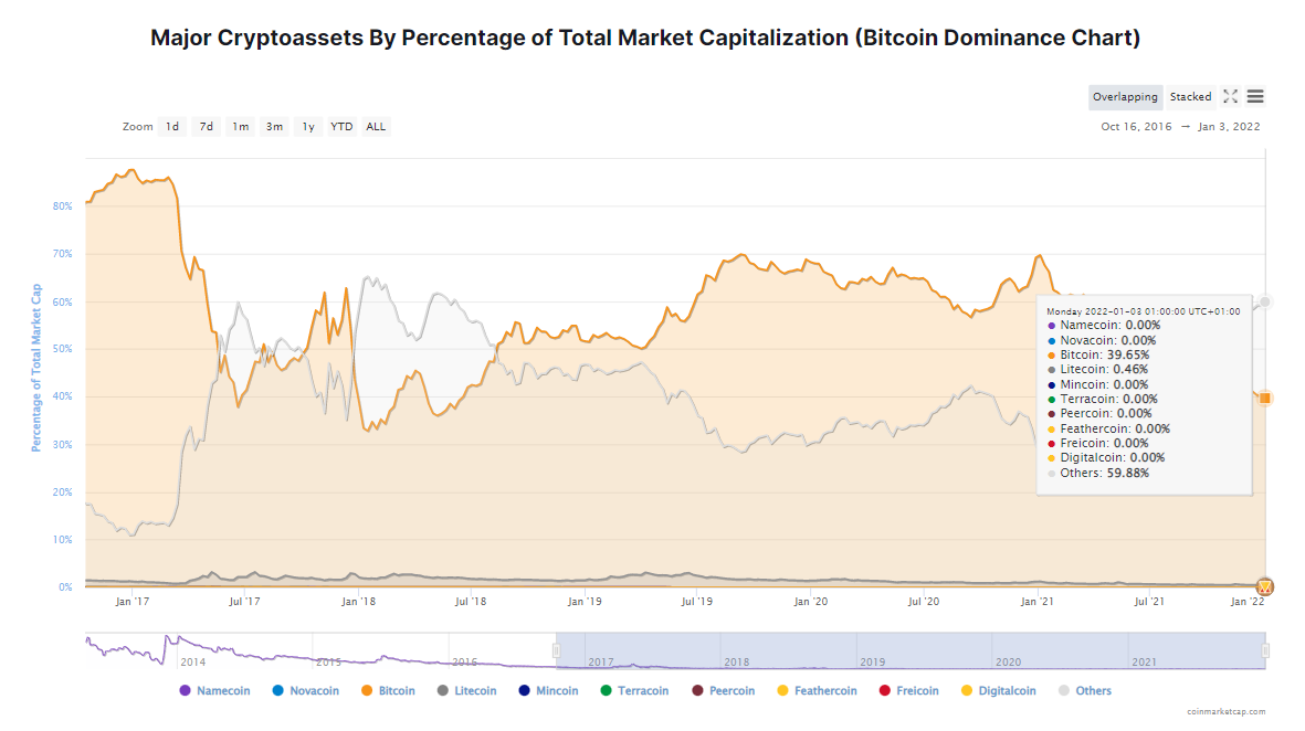 La semaine dernière a été plutôt négative pour le marché des crypto-monnaies. Le bitcoin n'a pas réussi à dépasser les 52 000 dollars et a terminé l'année 2021 autour de 47 200 dollars, tandis que l'Ethereum a chuté depuis son récent sommet à 4100 dollars et a testé le niveau de 3600 dollars. La domination du marché par le bitcoin a continué de chuter et est passée sous la barre des 40 % la semaine dernière. C'est très proche du plus bas niveau historique de 36,7% en janvier 2018. Selon des données récentes de TradingPlatforms, la baisse de la domination du marché par le bitcoin est un signe que la "saison des altcoins" pourrait être proche. Au cours des sept dernières années, la domination du marché par les altcoins a été multipliée par trois, passant de 21 % en 2014 à environ 60 % ce mois-ci.