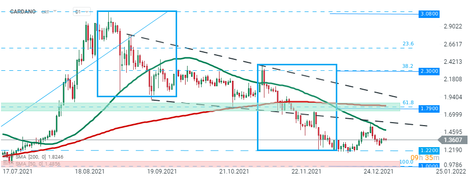 Le cours du CARDANO a rebondi sur le support de 1,22 $, qui est marqué par la limite inférieure de la structure 1:1, mais les acheteurs n'ont pas réussi à pousser le cours au-dessus de la limite inférieure du triangle qui coïncide avec la SMA 50 (ligne verte) et un mouvement latéral peut être observé. Néanmoins, si une cassure à la hausse se produit, le prochain objectif pour les acheteurs est situé à 1,79 $. Source : xStation5