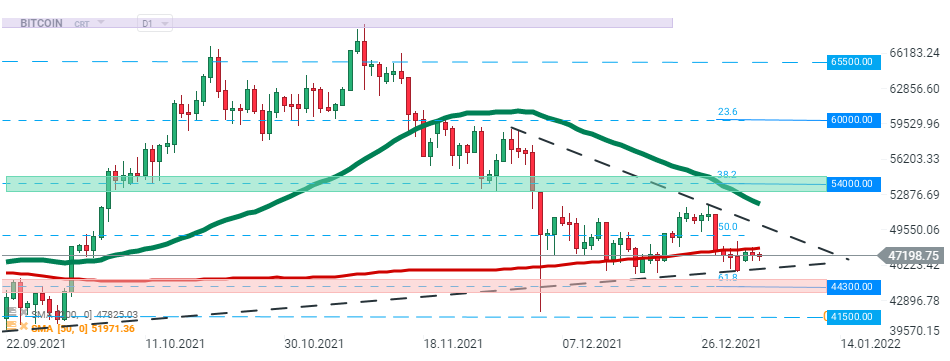 Le cours du BITCOIN a évolué au sein d'un range le mois dernier. Il semble que jusqu'à ce que nous voyions une cassure claire au-dessus du support à 43 300 $ ou de la zone de résistance autour de 54 000 $, la poursuite de la consolidation semble être le scénario le plus probable. Source : xStation5