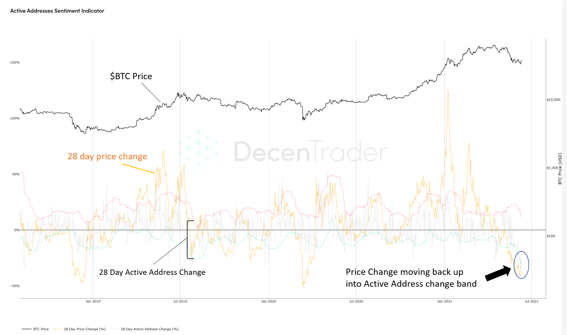 Signal haussier fourni par l'indicateur de sentiment des adresses actives. Source : Decentrader