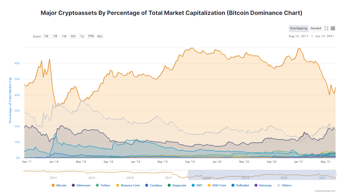 Les crypto-monnaies ont subi des pressions en début de semaine dernière, cependant les prix se sont stabilisés après avoir enregistré de solides gains au cours du week-end suite aux commentaires d'Elon Musk. Le PDG de Tesla a laissé entendre que son entreprise pourrait recommencer à accepter les paiements en crypto-monnaies. D'autres nouvelles en provenance du Salvador ont également renforcé le sentiment du marché. La domination du bitcoin est passée à 43,6 %. La capitalisation de tous les actifs numériques en circulation a augmenté à 1,68 trillion, tandis qu'un volume d'échange quotidien moyen est enregistré à 94,7 milliards de dollars.