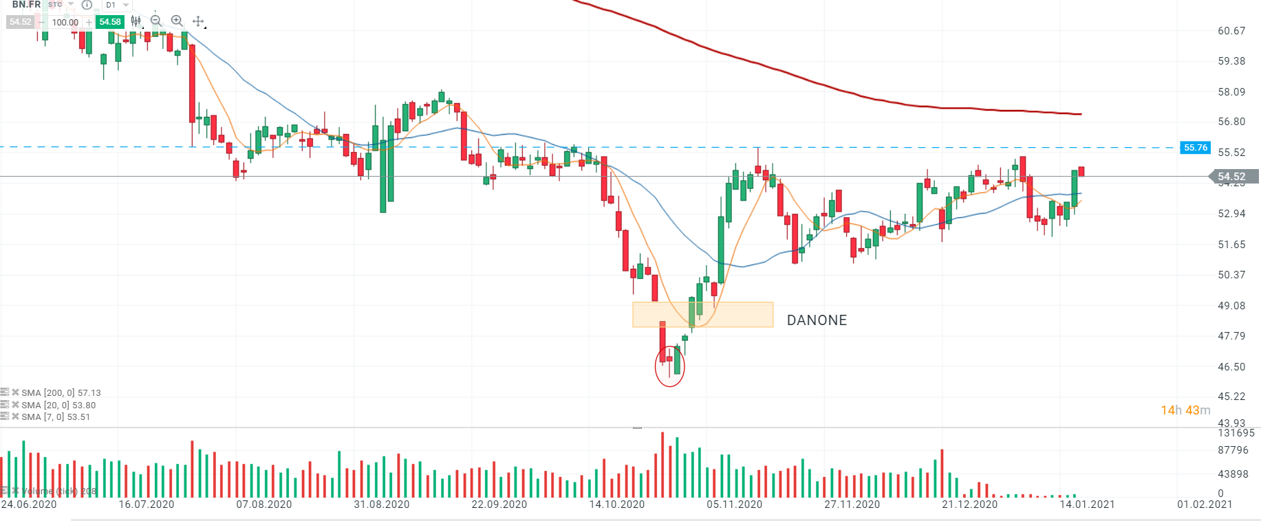 Les cours de Danone (BN.FR) ont ouvert avec un léger gap haussier avant de se replier. Si les cours parviennent à se redresser, la prochaine cible sera le sommet du 16/11 au niveau des 55,76. En cas de franchissement de ce niveau, le mouvement à la hausse pourrait s’accélérer pour plafonner sur la SMA 200 (ligne rouge) à 57,14. Source : xStation5