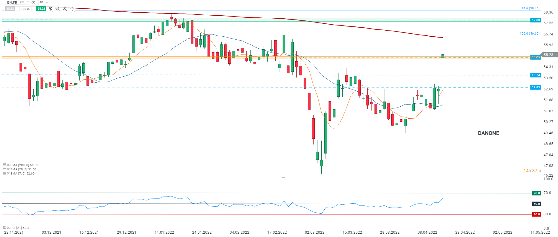 Les cours de Danone (BN.FR) ont ouvert avec un gap haussier massif, se dirigeant vers le retracement de Fibonacci à 100% de la hausse entamée en juillet 2021. Les perspectives haussières du titre sont renforcées par le fait que le RSI évolue au-dessus de sa zone de neutralité de 50, ce qui signifie que les acheteurs ont toujours l’avantage. Source : xStation5
