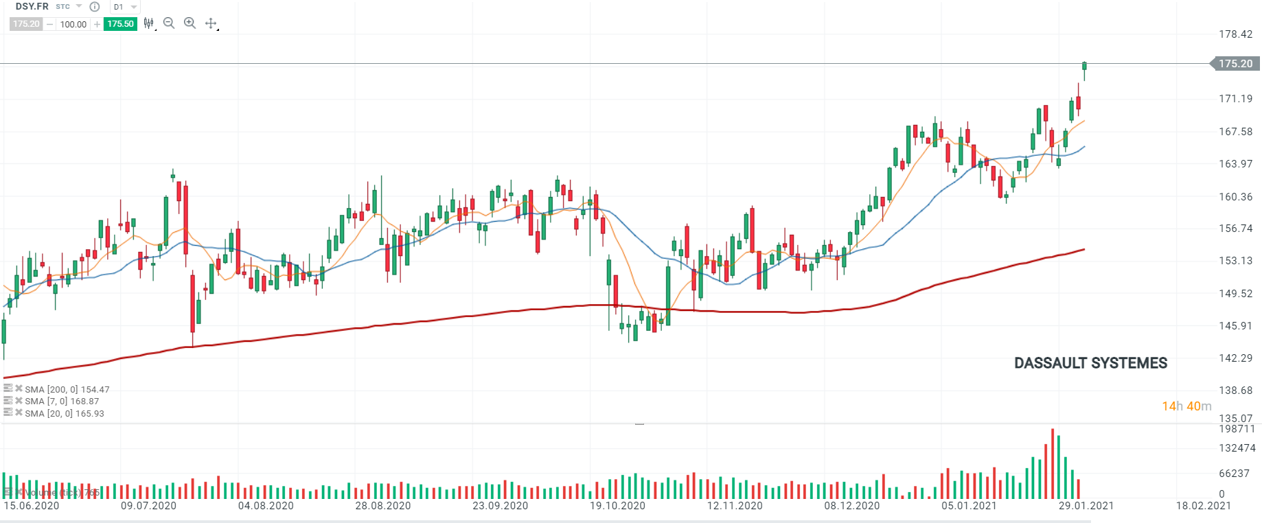 Les cours de Dassault Systèmes (DSY.FR) ont ouvert avec un important gap haussier atteignant ainsi un nouveau record historique. Si les cours parviennent à se hisser au-dessus du seuil symbolique à 180 euros, cela ouvrirait la voie à une poursuite de la hausse entamée mi-mars 2020. Depuis cette date l’action Dassault Systèmes gagne près de 70%. Source : xStation5