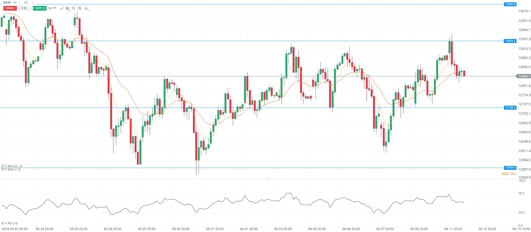 En Allemagne, nous avons pris connaissance de l’indice ZEW du sentiment économique pour le mois de juin. On note une forte baisse de l’indicateur sur la période. En effet, l’indice a été publié à -16,1, contre -14,6 en prévision. Un tel niveau n’avait pas été atteint depuis le mois de septembre 2012. L’institut d’études économiques (ZEW) a estimé que cette tendance est due aux tensions commerciales avec les Etats-Unis et aux craintes concernant le nouveau gouvernement italien. Pour rappel, Giovanni Tria, le nouveau ministre italien de l’Economie s’est exprimé dimanche et a affirmé l’attachement de l’Italie à la zone euro. Entre outre, Vitas Vasiliauskas (membre du Conseil des gouverneurs de la BCE) a estimé que l’Italie ne représente pas une menace pour l’ensemble de la zone euro. D’un point de vue technique, les cours évoluent sous les moyennes mobiles (à 7 et 21 périodes) en unité de temps horaire (H1). Le RSI est stable autour de sa zone de neutralité. En conclusion, nous avons un biais vendeur avec comme objectif le niveau des 12 738 points.