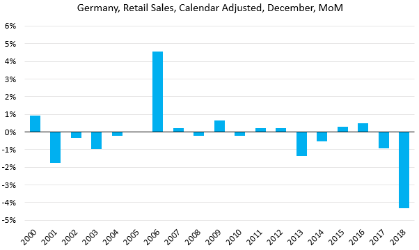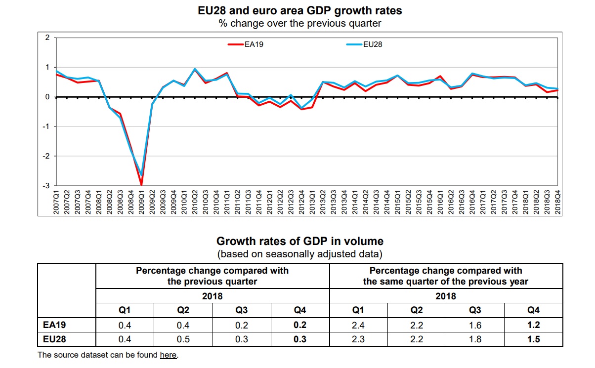 En Allemagne, les ventes au détail ont reculé de 4,3 % sur le seul mois de décembre et de 2,1 % sur un an. En outre, le taux de chômage est resté stable à 5 % de la population active sur le mois de janvier. Du côté de la zone euro, la première estimation d’Eurostat indique que la croissance continue d’évoluer à son rythme le plus faible depuis quatre ans. En effet, l’économie a enregistré une croissance de son produit intérieur brut (PIB) de 0,2 % au quatrième trimestre et de 1,2 % sur un an.