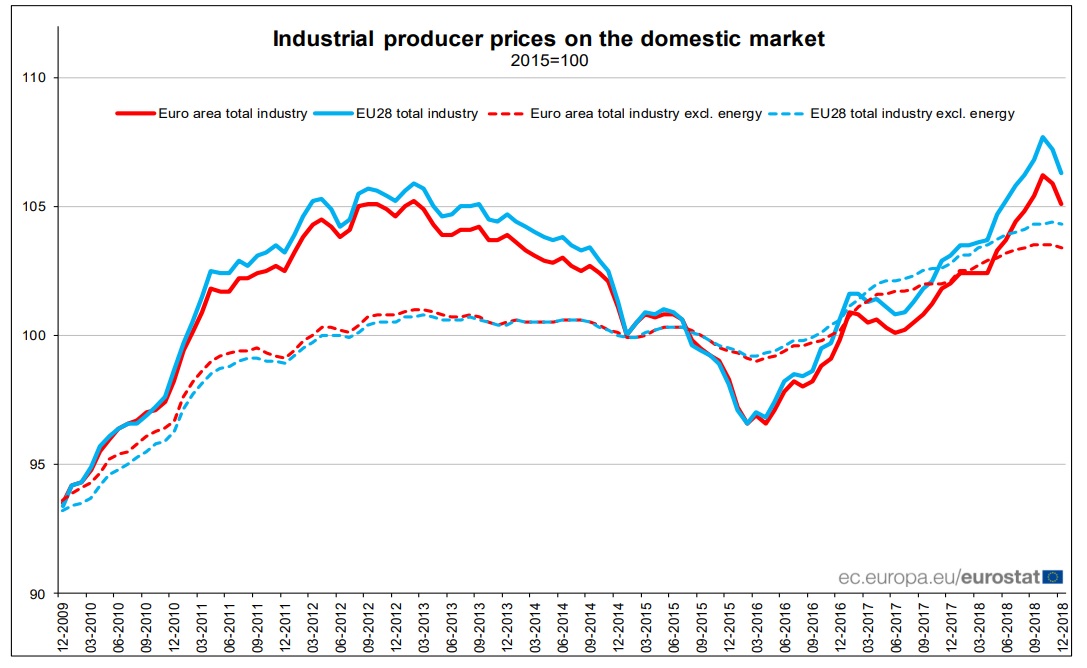 En zone euro, les prix à la production (PPI) se sont contractés de 0,8 % au titre du mois de décembre. Sur un an, ils ont progressé de seulement 3 %, contre une hausse de 4 % (sur un an) au mois de novembre. La baisse des PPI s’explique par la contraction des prix du pétrole au quatrième trimestre 2018 (T4 2018). Et pour cause, ces derniers ont perdu 40 % en l’espace trois mois.