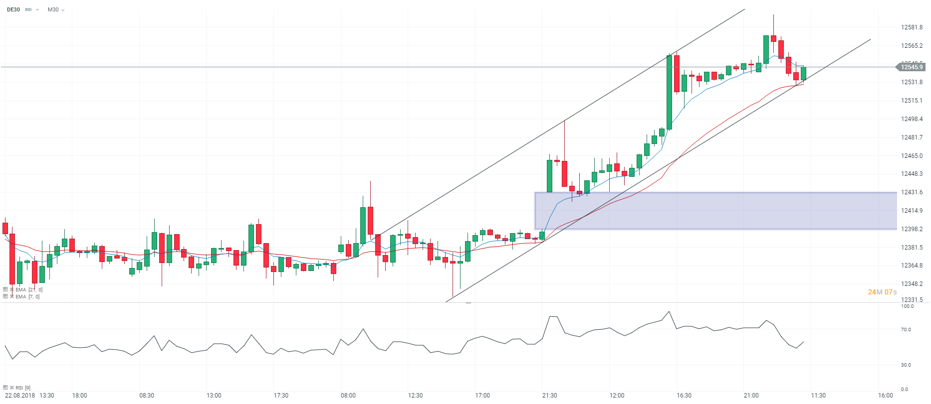 D’un point de vue technique, le DAX 30 évolue en tendance haussière en unité de temps 30 minutes (M30). En effet, nous observons sur le graphique ci-dessous que les prix fluctuent à l’intérieur d’un canal ascendant et qu’ils sont soutenus par la moyenne mobile à 21 périodes. Toutefois, nous notons un certain nombre de vecteurs baissiers sur l’actif :