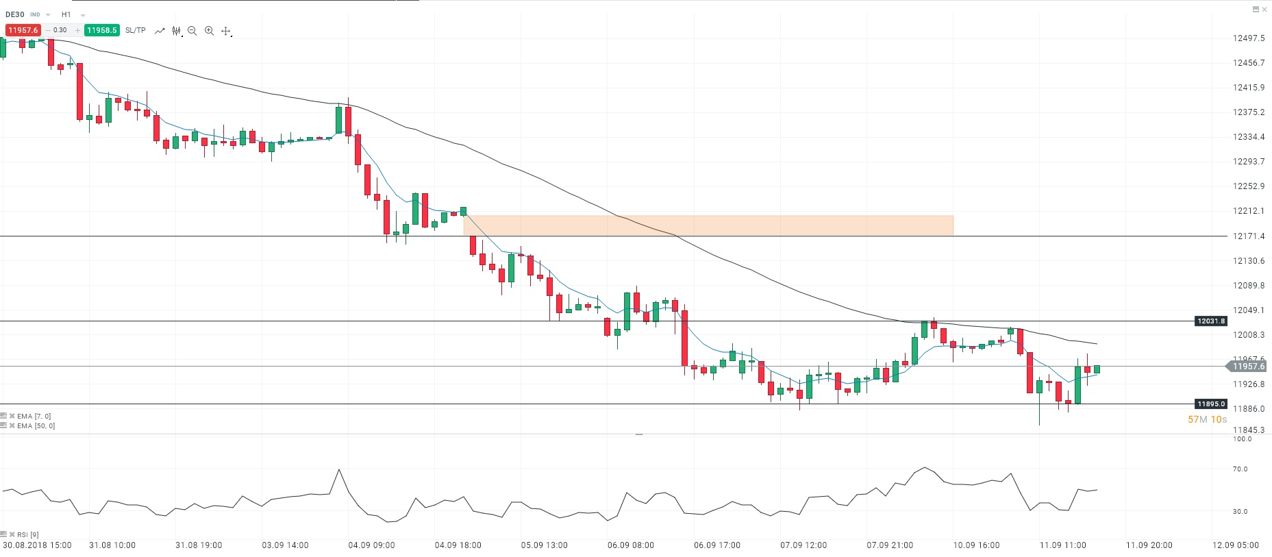 Sans surprise, l’indice ZEW de confiance des investisseurs est resté négatif au mois de septembre (- 10,6). La confiance des investisseurs et des analystes reste fragilisée par le contexte commercial sino-américain. Pour rappel, les Etats-Unis souhaitent désormais taxer l’intégralité des produits d’importations en provenance de Chine, soit 517 milliards de dollars. De son côté, la Chine a demandé l’autorisation à l’OMC de mettre en place des mesures de rétorsion contre les Etats-Unis. Sur le plan technique, le DAX 30 (DE30) évolue en tendance baissière en unité de temps horaire (H1). Et pour cause, l’actif est capé par la moyenne mobile à 21 périodes. Néanmoins, nous faisons état de velléités haussières sur l’indice car les prix sont soutenus par la moyenne mobile à 7 périodes. Dans un tel contexte, nous sommes acheteurs de l’indice et pensons qu’il devrait rallier le niveau des 12 000 points à court terme.