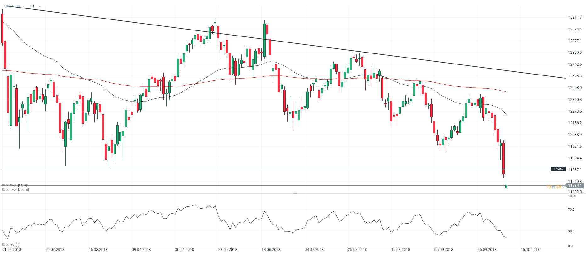 Les marchés sont pénalisés par la forte remontée des rendements obligataires, la dégradation du contexte commercial et le ralentissement de la croissance chinoise. En outre, nous notons que les valorisations des marchés reposaient sur une base relativement restreinte. Typiquement, la récente hausse du S&P500, Nasdaq 100 et Dow Jones 30 s’appuyait sur le secteur de la « tech » américaine et des pétrolières. Au moment où nous écrivons ces lignes, le DAX 30 (DE30) perd plus de 1,5 % autour des 11 534 points après avoir touché le niveau des 11 454 points à l’ouverture du marché. Evidemment, l’indice évolue sur ses plus bas de l’année et évolue en tendance baissière en unité de temps journalière (D1). Nous notons sur le graphique ci-dessus que les prix évoluent sous les moyennes mobiles à 50 et 200 périodes. Dans le même temps, le RSI est orienté à la baisse et fluctue à l’intérieur de sa zone de survente. Dans un tel contexte, nous tablons sur une poursuite de la baisse et donc un retour des cotations à 11 500 points.