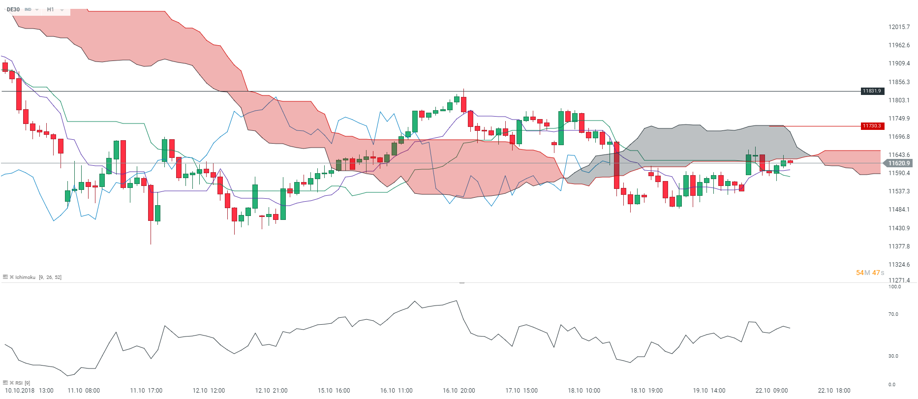 Au regard du critère Ichimoku, le DAX 30 évolue en légère tendance haussière en unité de temps horaire (H1). Nous observons sur le graphique ci-dessus que les prix sont soutenus par la Kijun (courbe verte) et la Tenkan (courbe mauve). Dans le même temps, les prix ont intégré le nuage Kumo et la Lagging-Span est orientée à la hausse. Dans ce contexte, nous avons un biais haussier sur l’indice allemand et pensons qu’il pourrait retrouver le niveau des 11 670 points à court terme.