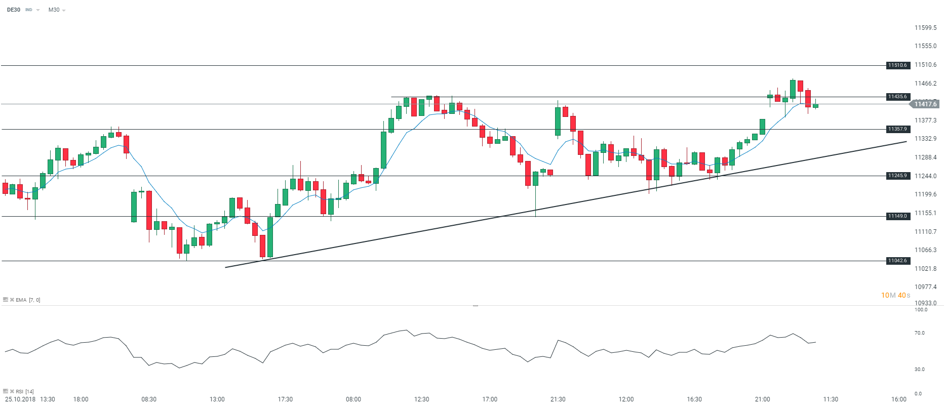 Sur le plan technique, le DAX 30 (DE30) évolue en tendance haussière en unité de temps 30 minutes (M30). En effet, nous observons sur le graphique ci-dessus que les prix sont soutenus par la moyenne mobile à 7 périodes. De plus, le RSI est orienté à la hausse et se stabilise au-dessus de sa zone de neutralité, autour de 58,9. Dans ce contexte, nous avons un biais positif sur l’indice allemand et pensons qu’il pourrait rallier le niveau des 11 510 points à court terme.