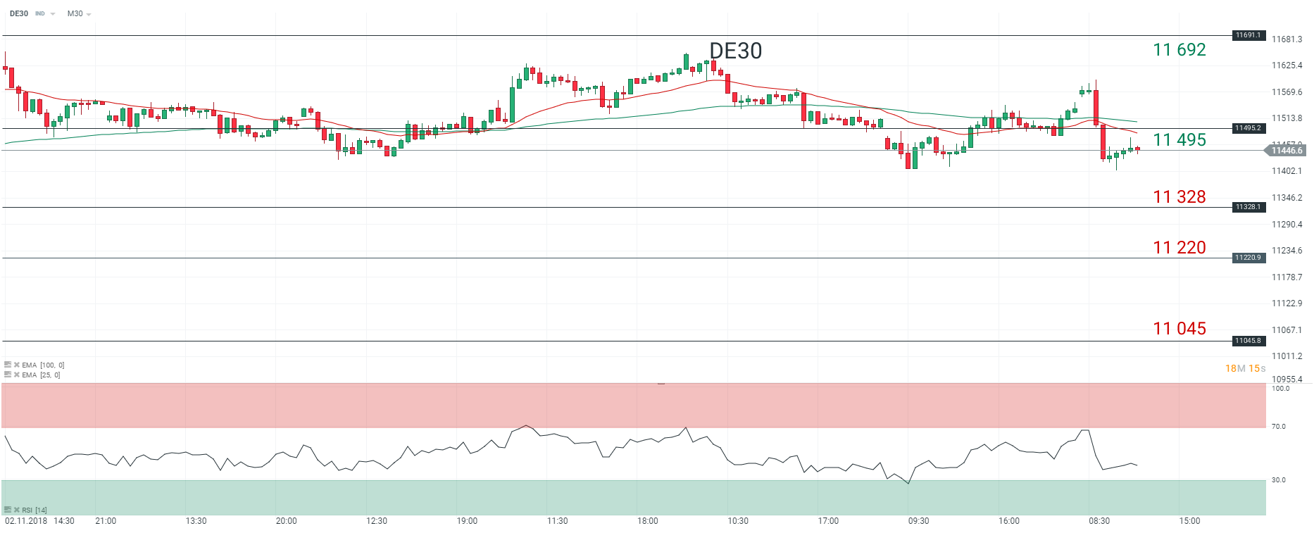 Au moment où nous écrivons ces lignes, le DAX 30 (DE30) accuse un repli de 0,60 % à 11 442 points. Sur le plan technique, l’indice évolue en tendance baissière en unité de temps 30 minutes (M30). En effet, nous observons sur le graphique ci-dessus que les prix sont capés par les moyennes mobiles à 25 et 100 périodes. De plus, le RSI est stable mais oscille sous sa zone de neutralité. En Europe, l’Italie continue de faire les gros titres de la presse financière. En effet, le gouvernement n’a toujours pas proposé de nouveau plan budgétaire pour 2019 à la Commission européenne, alors que la date butoir du 13 novembre approche. Pour le consensus, la Commission devrait lancer une procédure contre l’Italie pour « déficit excessif ». Pour conclure, nous avons un biais positif sur l’indice DAX 30 et pensons qu’il devrait rallier le niveau des 11 480 points à court terme.