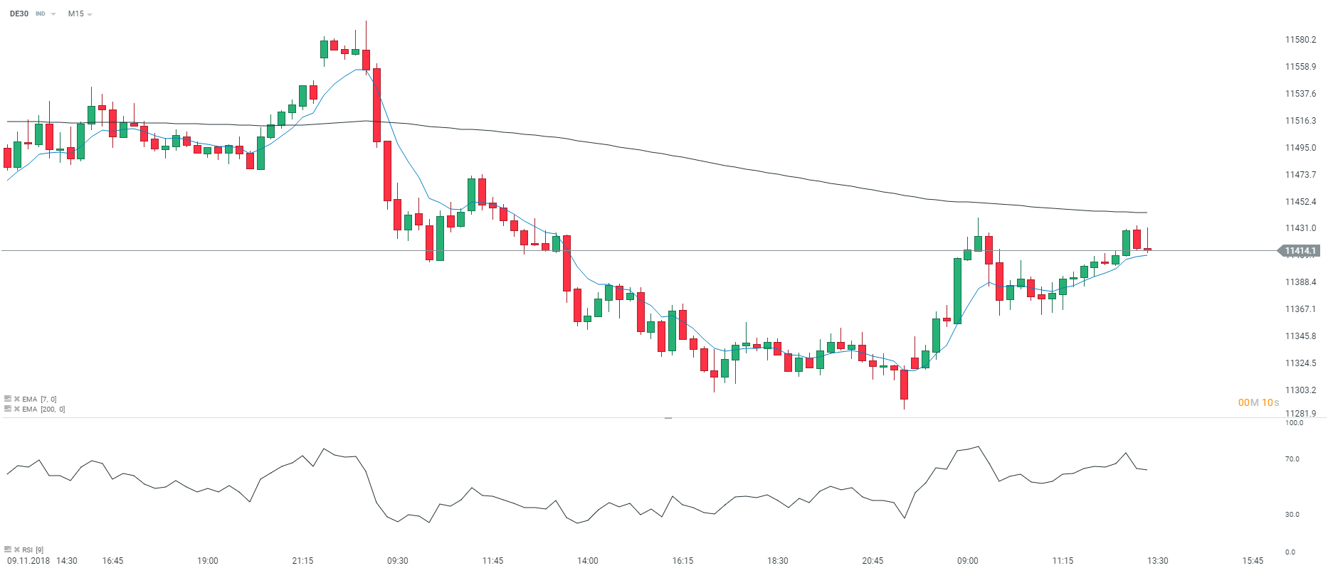 Au moment où nous écrivons ces lignes, le DAX 30 (DE30) progresse de 0,83 % à 11 414 points. En Allemagne, l’indice ZEW de confiance des investisseurs est ressorti négatif à 24,1 au titre du mois de novembre. Toutefois, nous notons une petite amélioration de l’indice par rapport au mois d’octobre (+ 0,6 point). Sur le plan technique, le DAX 30 retrouve des couleurs en unité de temps 15 minutes (M15). En effet, nous observons sur le graphique ci-dessus que les prix sont portés par la moyenne mobile à 7 périodes et le RSI fluctue au-dessus de sa zone de neutralité. Néanmoins, nous remarquons que les prix sont capés par la moyenne mobile à 200 périodes qui fait office de résistance. Pour conclure, nous conservons un biais acheteur sur l’indice DAX 30 (DE30) et pensons qu’il pourrait rallier le niveau des 11 440 points à court terme.