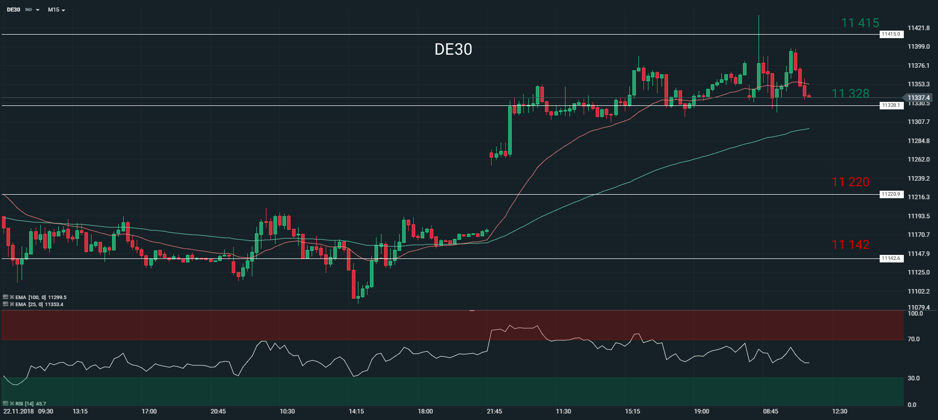 Au moment où nous écrivons ces lignes, le DAX 30 (DE30) accuse un repli de 0,19 % à 11 339 points. Sur le plan technique, l’indice évolue (globalement) en tendance haussière en unité de temps 15 minutes (M15). En effet, nous observons sur le graphique ci-dessus que l’indice évolue toujours au-dessus du gap haussier formé lundi à l’ouverture des cotations et au-dessus de la moyenne mobile à 100 périodes. Néanmoins, nous notons que les intentions vendeuses se matérialisent au travers de la moyenne mobile à 25 périodes, d’autant que le RSI est orienté à la baisse. Dans un tel contexte, nous avons un biais baissier et anticipons un retour des cotations sur le niveau des 11 300 points à court terme.