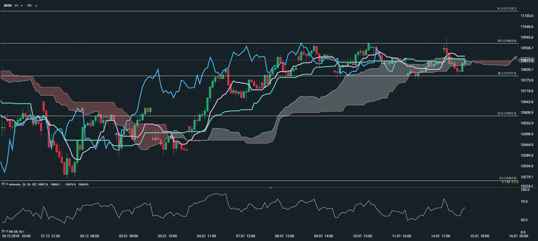 D’un point de vue technique, le DAX 30 évolue en « trading range » en unité de temps horaire (H1). En effet, nous observons sur le graphique ci-dessus que les prix fluctuent à l’intérieur du nuage Kumo et sous les courbes Tenkan (courbe mauve) et Kijun (courbe verte). Néanmoins, le RSI progresse au-dessus de sa zone de neutralité, autour de 57,4. Dans la mesure où le DAX 30 évolue au-dessus du support des 10 797 points (38,2 % retracements de Fibonacci), nous avons un avis positif sur le DAX 30 et anticipons un retour sur le niveau des 10 963 points, soit le niveau des 50 % des retracements de Fibonacci.
