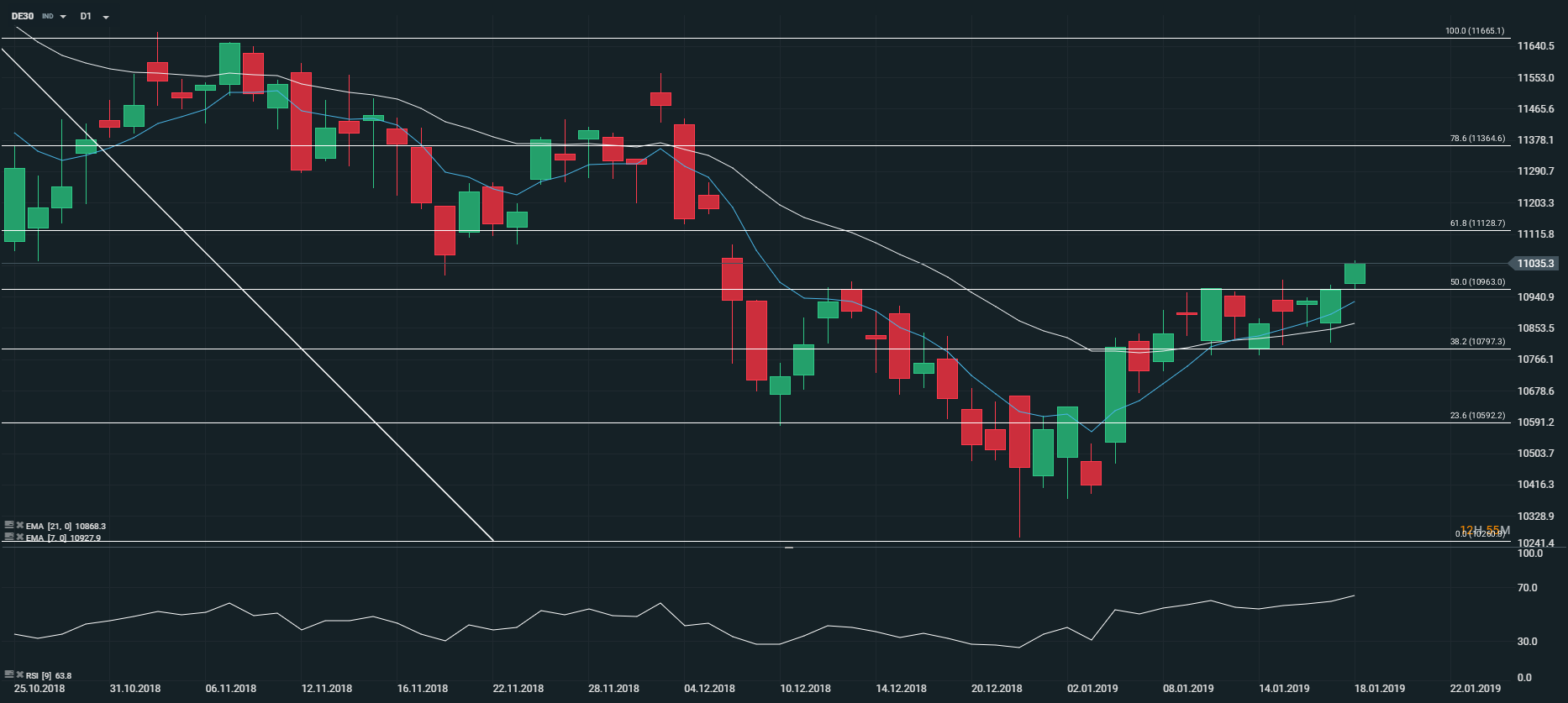 Au moment où nous écrivons ces lignes, le DAX 30 gagne 1,08 % à 11 033 points. Sur le plan technique, la toile de fond est haussière en unité de temps journalière (D1). En effet, nous observons sur le graphique ci-dessus que les prix sont soutenus par les moyennes mobiles à 7 et 21 périodes, et ce, depuis plusieurs jours. De son côté, le RSI est orienté à la hausse et oscille au-dessus de sa zone de neutralité, autour des 63,8. A moyen terme, l’indice devrait poursuivre sa progression en direction des 61,8 % des retracements de Fibonacci, soit le seuil des 11 128 points. Néanmoins, nous anticipons une phase de consolidation autour des cotations actuelles à court terme.