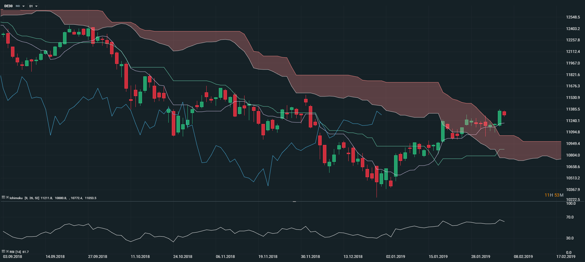 En Allemagne, les commandes d’usines ont reculé de 1,6 % au titre du mois de décembre 2018. Sans grande surprise, l’indice DAX 30 (DE30) accuse un repli de 0,50 % à 11 310 points. Néanmoins, sur le plan technique, nous observons sur le graphique ci-dessus que les cours évoluent en tendance haussière en unité de temps journalière (D1). En effet, les prix sont soutenus par le nuage Kumo, la Tenkan (courbe mauve) et la Kijun (courbe verte). Par ailleurs, nous remarquons que la Lagging-Span (courbe bleue) est orientée à la hausse et fluctue au-dessus des prix. Malgré la correction de ce mercredi, nous notons que la toile de fond est encourageante. Toutefois, la rupture des 11 219 (Tenkan) points pourrait faire basculer la tendance.