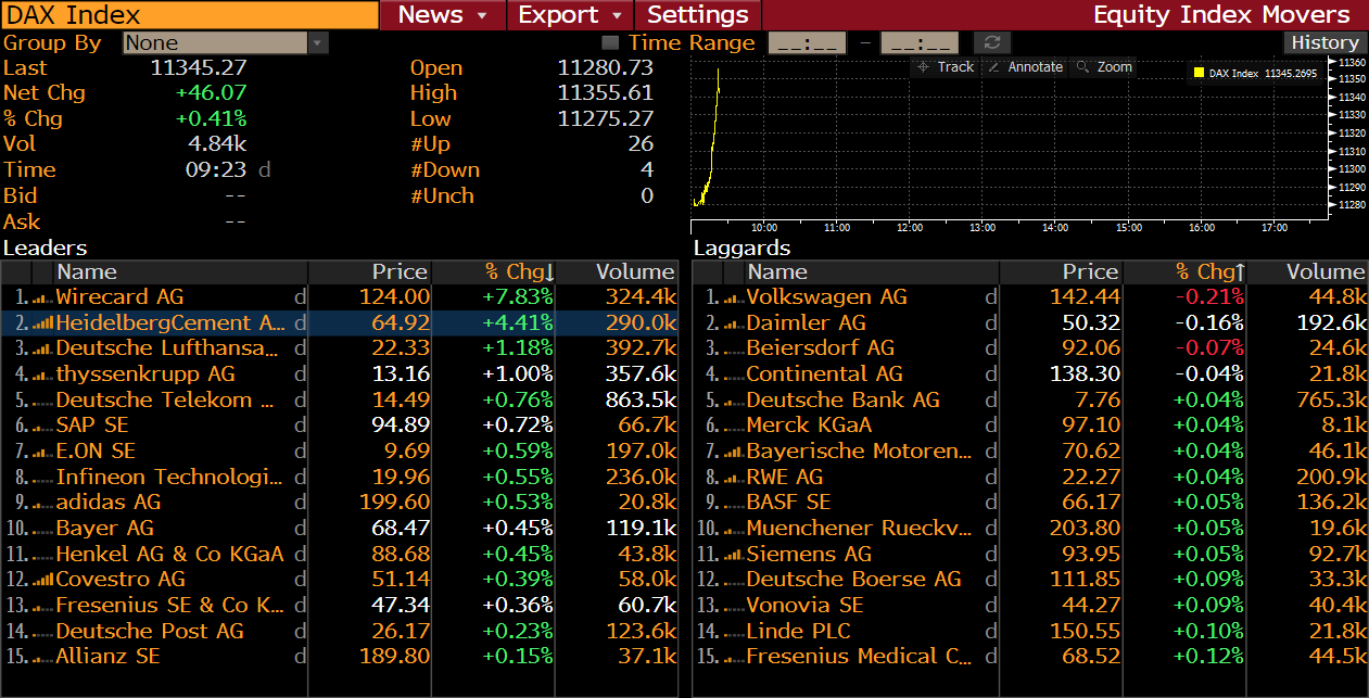 Wirecard (WDI.DE) et HeidelbergCement (HEI.DE) tirent l’indice allemand – source : Bloomberg