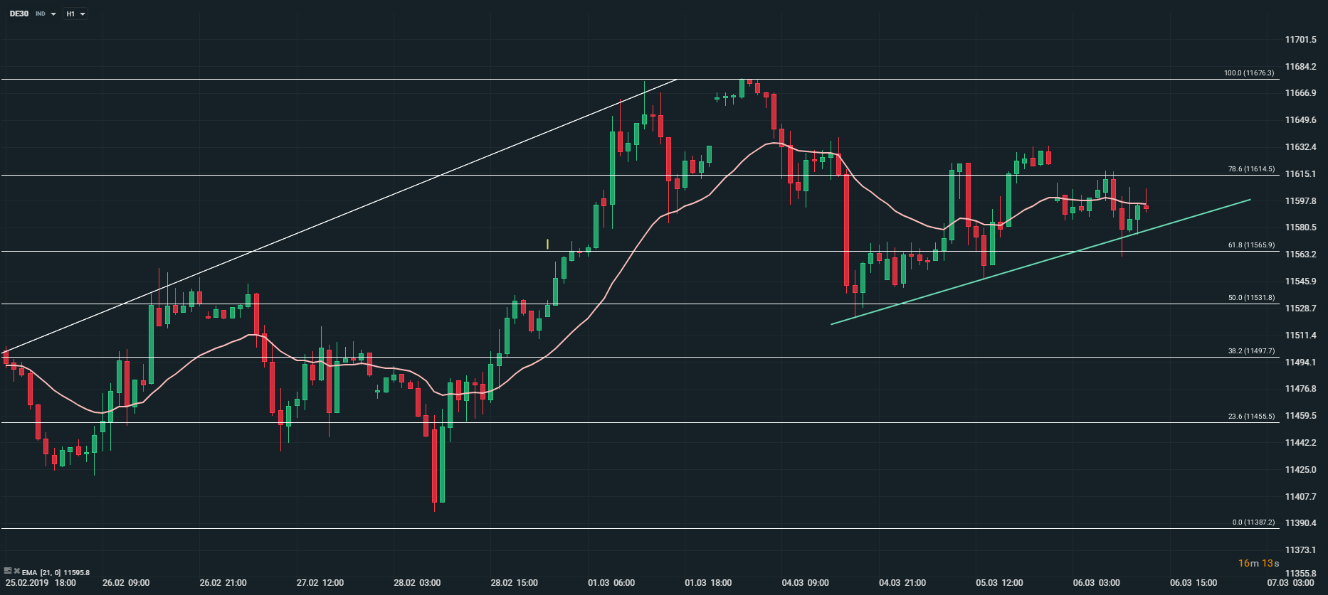 Au moment où nous écrivons ces lignes, le DAX 30 accuse un repli de 0,16 % à 11 593 points. Malgré la correction de ce mercredi, nous notons que les prix évoluent en tendance haussière unité de temps journalière (D1). En effet, nous observons sur le graphique ci-dessus que les prix sont portés par la Tenkan (courbe mauve), la Kijun (courbe verte) et le nuage Kumo. Enfin, la Lagging-Span (courbe bleue) est orientée à la hausse et oscille au-dessus des prix depuis plusieurs semaines. Enfin, le RSI est stable et continue de progresser autour de sa zone de surachat.