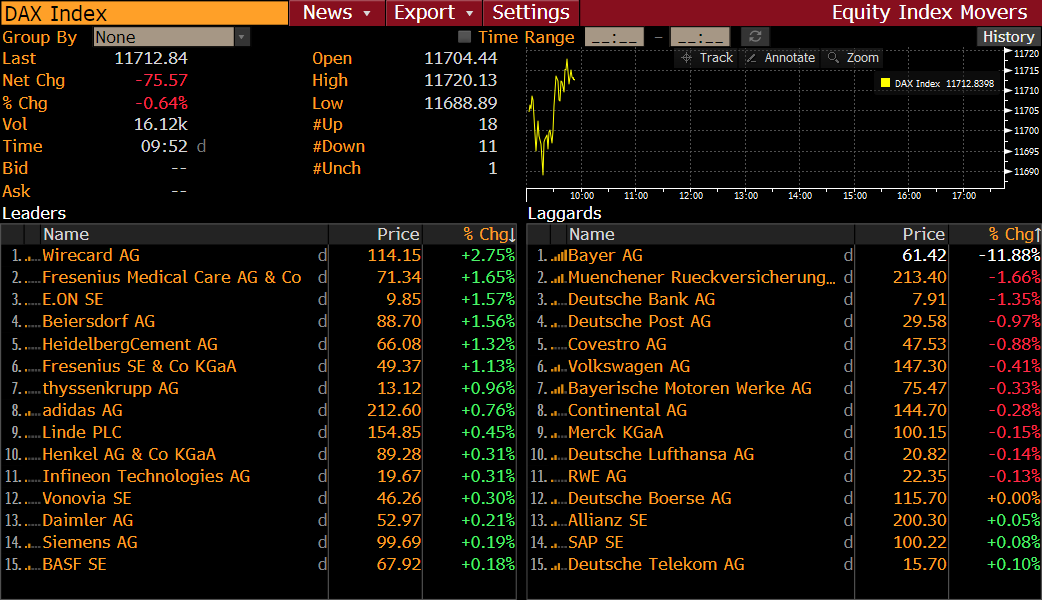 Bayer (BAYN.DE) s’effondre de 12,05 % à 61,30 € ce matin après la décision d’un tribunal américain sur le Round Up de Monsanto. Le produit phare du chimiste serait bel et bien une cause de cancer selon le tribunal. Source: Bloomberg