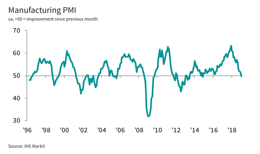 D’après le communiqué publié par IHS Markit, la baisse de l’activité manufacturière s’explique par les incertitudes associées aux tensions commerciales sino-américaines et la faiblesse de la demande dans le secteur automobile. Pour ne rien arranger, le taux inflation (à la production) est retombé sur un plus bas de 27 mois.