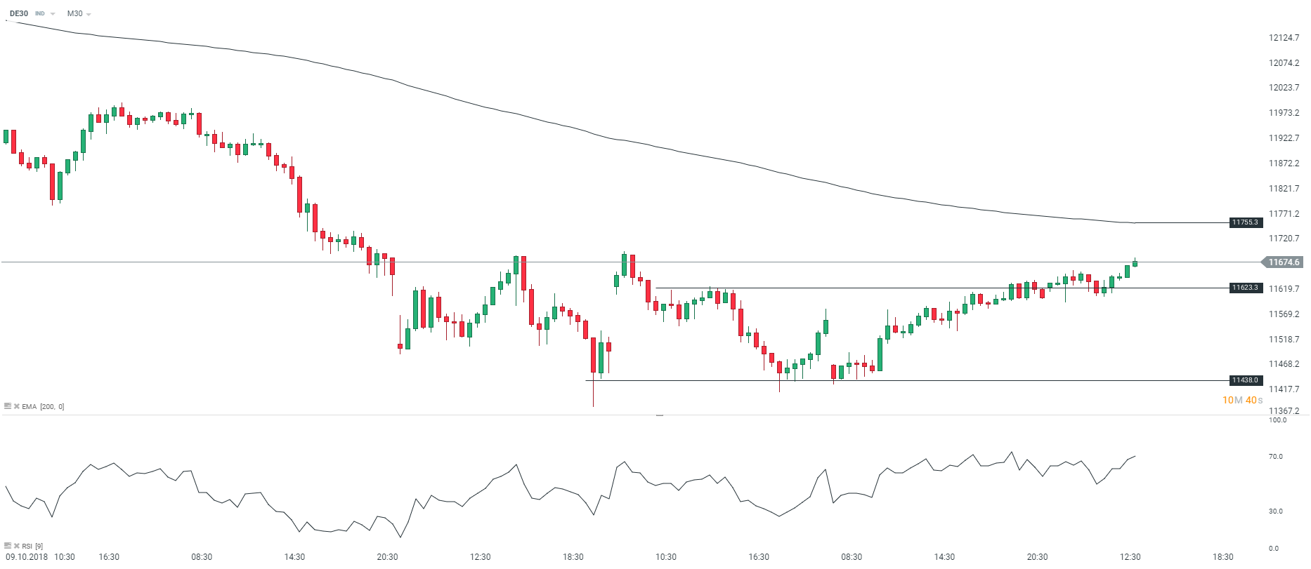 En Allemagne, l’indice ZEW de confiance des investisseurs s’est contracté de 14,1 points à 24,7 au mois d’octobre. En cause : la guerre commerciale qui oppose les Etats-Unis et la Chine. Concernant la balance commerciale en zone euro, elle s’est repliée de 5,9 milliards d’euros à 11,7 milliards au titre du mois d’août. Malgré des mauvaises données macroéconomiques, nous remarquons que le DAX 30 (DE30) a retrouvé les plus hauts du vendredi 12 octobre. En effet, au moment où nous écrivons ces lignes, l’indice allemand progresse de 0,57 % à 11 677,1 points. Evidemment, la toile de fond est haussière en unité de temps 30 minuites (M30) car les prix sont soutenus par le support des 11 620 points. Dans un tel contexte, nous avons un avis positif sur l’indice et pensons qu’il devrait retrouver le niveau des 11 750 points à court terme.