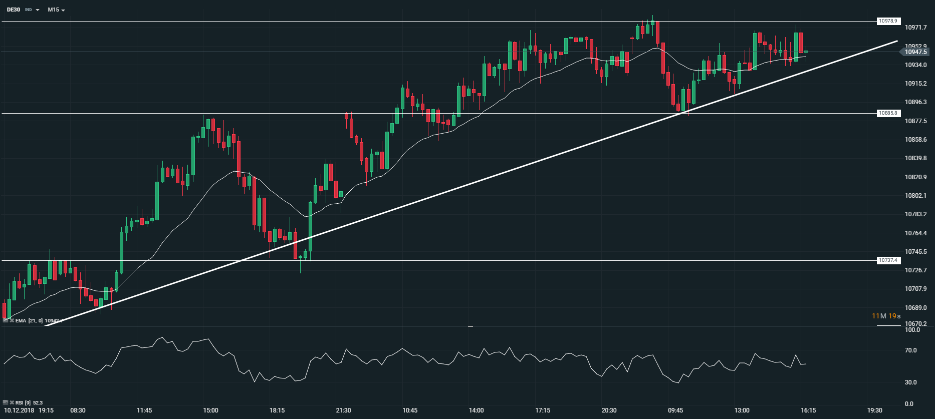 En Allemagne, l’indice des prix à la consommation est ressorti en ligne avec les attentes à 2,3 % au mois de novembre et à 2,3 % en rythme annualisé. Sans grande surprise, la Banque centrale européenne a laissé sa politique monétaire inchangée et confirmé l’arrêt de ses achats d’actifs à partir de 2019. Sur le plan technique, le DAX 30 (DE30) évolue en tendance haussière en unité de temps 15 minutes (M15). En effet, nous observons sur le graphique ci-dessus que les prix sont portés par la moyenne mobile à 21 périodes. De son côté, le RSI est positif et fluctue au-dessus de sa zone de neutralité autour de 52,3. Dans ce contexte, nous avons un biais positif sur l’indice à court terme. Néanmoins, en cas de rupture du support oblique hebdomadaire, le DAX 30 pourrait renouer avec le niveau des 10 885 points.