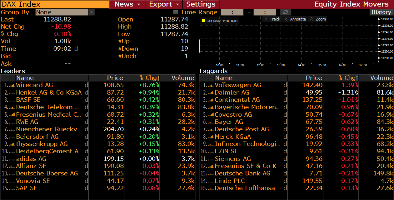 Wirecard (WDI.DE) est en hausse de plus de 11% au moment de la rédaction de ce commentaire. Pour rappel, le régulateur a décidé d’interdire de manière temporaire les ventes à découvert sur le titre (deux mois). Celui-ci a justifié sa décision par le fait que la volatilité des prix risquait de saper le moral du marché boursier au sens large. Rappelons que l’action Wirecard a fait l’objet de fortes variations après les éléments rapportés par le Financial Times. En conséquence, les investisseurs ont augmenté leurs paris baissiers, exerçant une pression à la baisse massive sur le titre.
