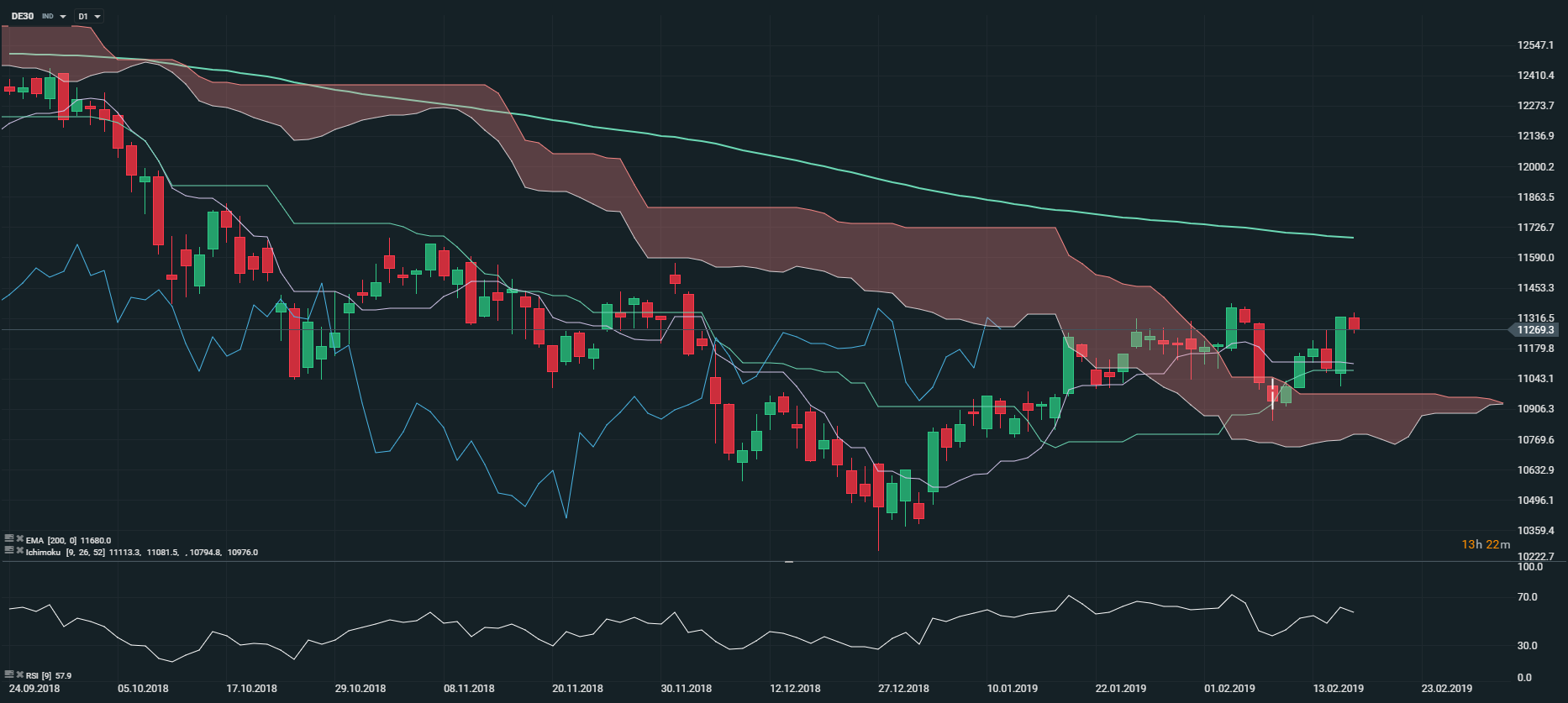 En unité de temps journalière (D1), l’indice évolue en tendance haussière. En effet, nous observons sur le graphique ci-dessous que les prix sont portés par le nuage Kumo, la Tenkan (courbe mauve) et la Kijun (courbe verte). Dans le même temps, la Lagging-Span (courbe bleue) est orientée à la hausse et fluctue au-dessus des prix. Concernant le RSI, nous remarquons que l’oscillateur évolue au-dessus de sa zone de neutralité, autour de 57,9. Malgré la correction de ce lundi, nous restons optimistes sur l’évolution du DAX 30 à court/moyen terme.