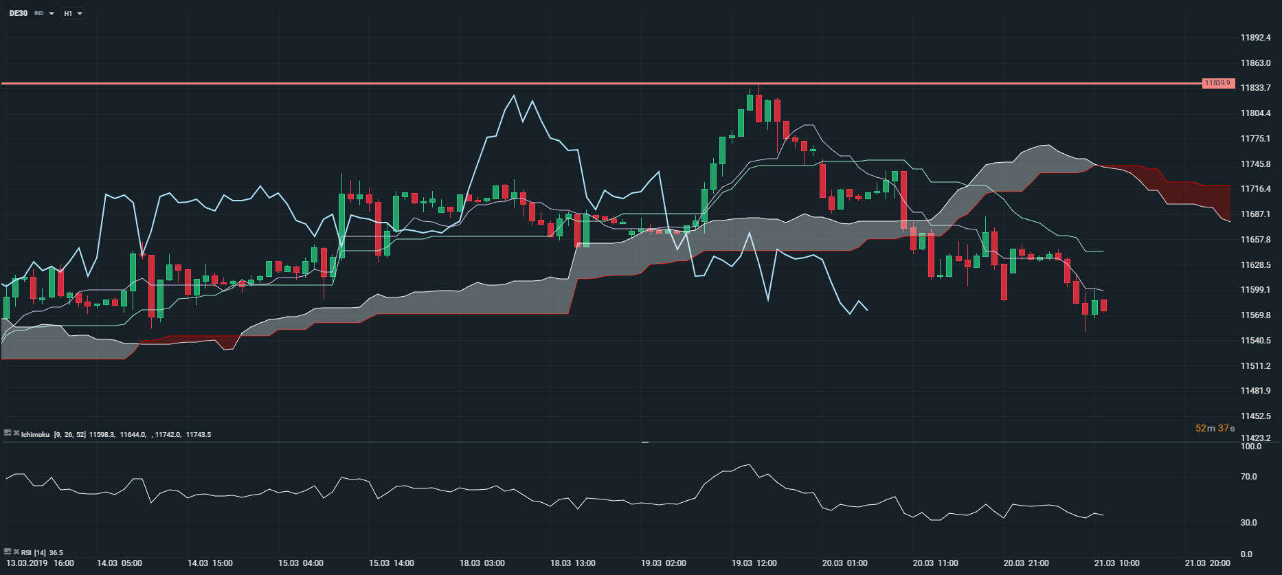 Au moment où nous écrivons ces lignes, le DAX 30 accuse un repli de 0,43 % à 11 585 points. D’un point de vue technique, la tendance demeure baissière en unité de temps horaire (H1). En effet, nous observons sur le graphique ci-dessus que les prix sont capés par le nuage Kumo, la Tenkan (courbe mauve) et la Kijun (courbe verte). Dans le même temps, la Lagging-Span (courbe bleue) est orientée à la baisse et fluctue sous les prix. De son côté, le RSI perd du terrain et fluctue désormais sous sa zone de neutralité, autour de 37,5.