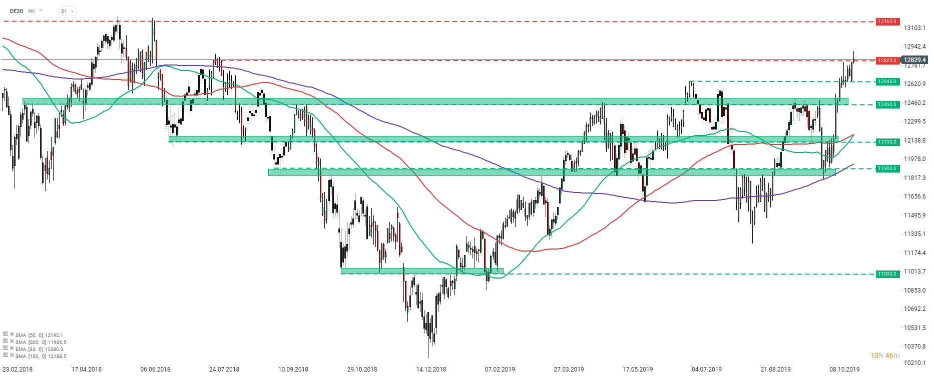Le DE30 allemand (sous-jacent DAX) a bondi au début de la séance européenne. Les indices PMI français, meilleurs que prévu, ont été à l'origine de cette hausse. L'indice a grimpé au plus haut niveau depuis la mi-juin 2018, mais s'est retiré de ce niveau lorsque les PMI allemands sont devenus légèrement inférieurs aux attentes. Néanmoins, la dynamique sur le marché du DE30 est solide et l’indice continue de briser les niveaux de résistance qui ont suivi. Les humeurs optimistes d’aujourd’hui ont poussé l’indice au-dessus du sommet atteint entre le début du mois de juillet et août 2018. Le niveau le plus proche pour les acheteurs à surveiller est caractérisé par le double top de mai à juin 2018 (13160 pts). Les traders doivent garder à l’esprit que, même si la réunion de la BCE d’aujourd’hui ne sera probablement pas un événement, certaines fluctuations de prix à court terme pourraient survenir pendant la conférence (débutant à 14h30, heure de Paris). Si l'humeur se détériorait, le DE30 pourrait tester le support des 12825 pts.