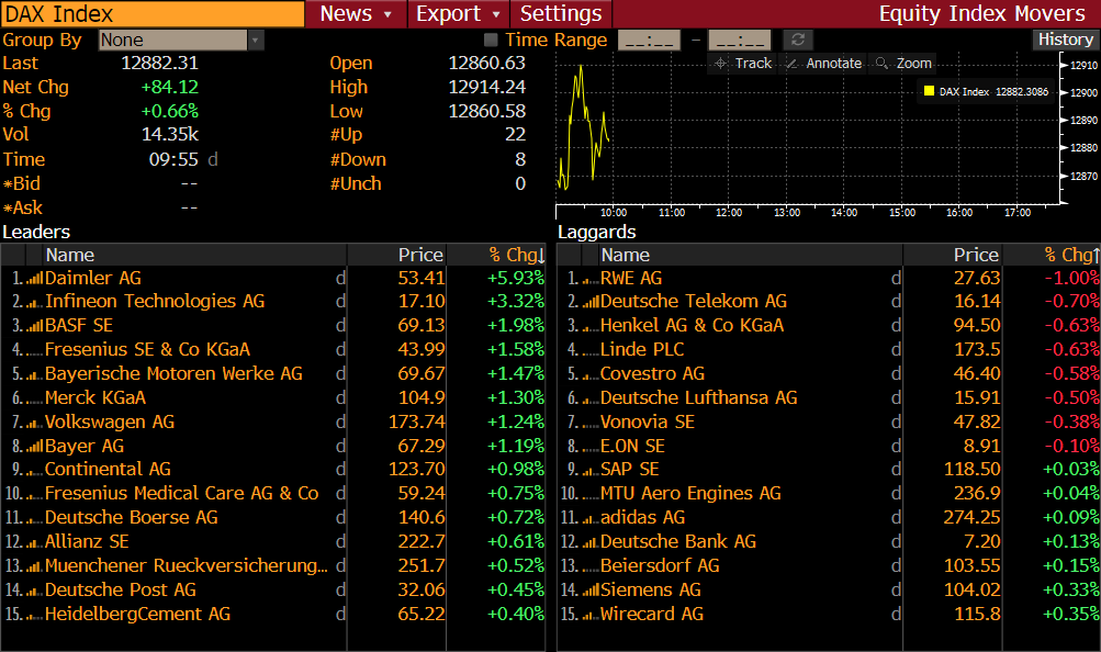 Les membres du DAX à 9h55, heure de Paris. Source: Bloomberg