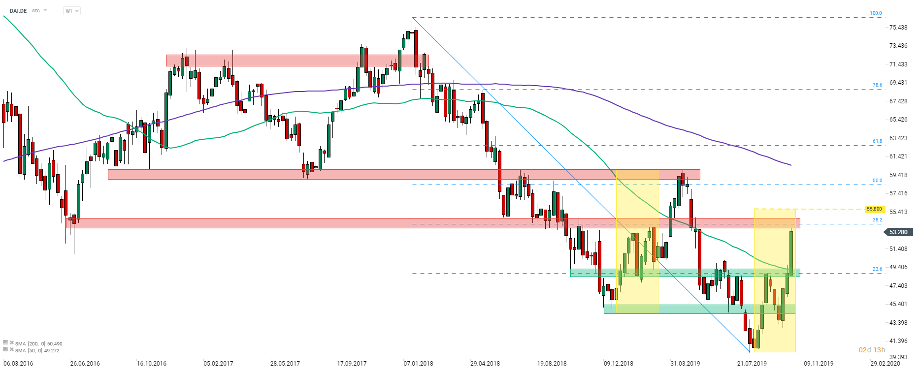 Daimler (DAI.DE) progresse grâce au solide rapport sur les résultats du troisième trimestre. Le cours de l'action approche de la zone de résistance et se situe autour du niveau Fibo de 38,2% du mouvement à la baisse commencé en janvier 2018. Si les haussiers parviennent à briser cette résistance, l'attention sera portée sur le montant de 55,80 € - la limite supérieure de la structure Overbalance. Source: xStation5