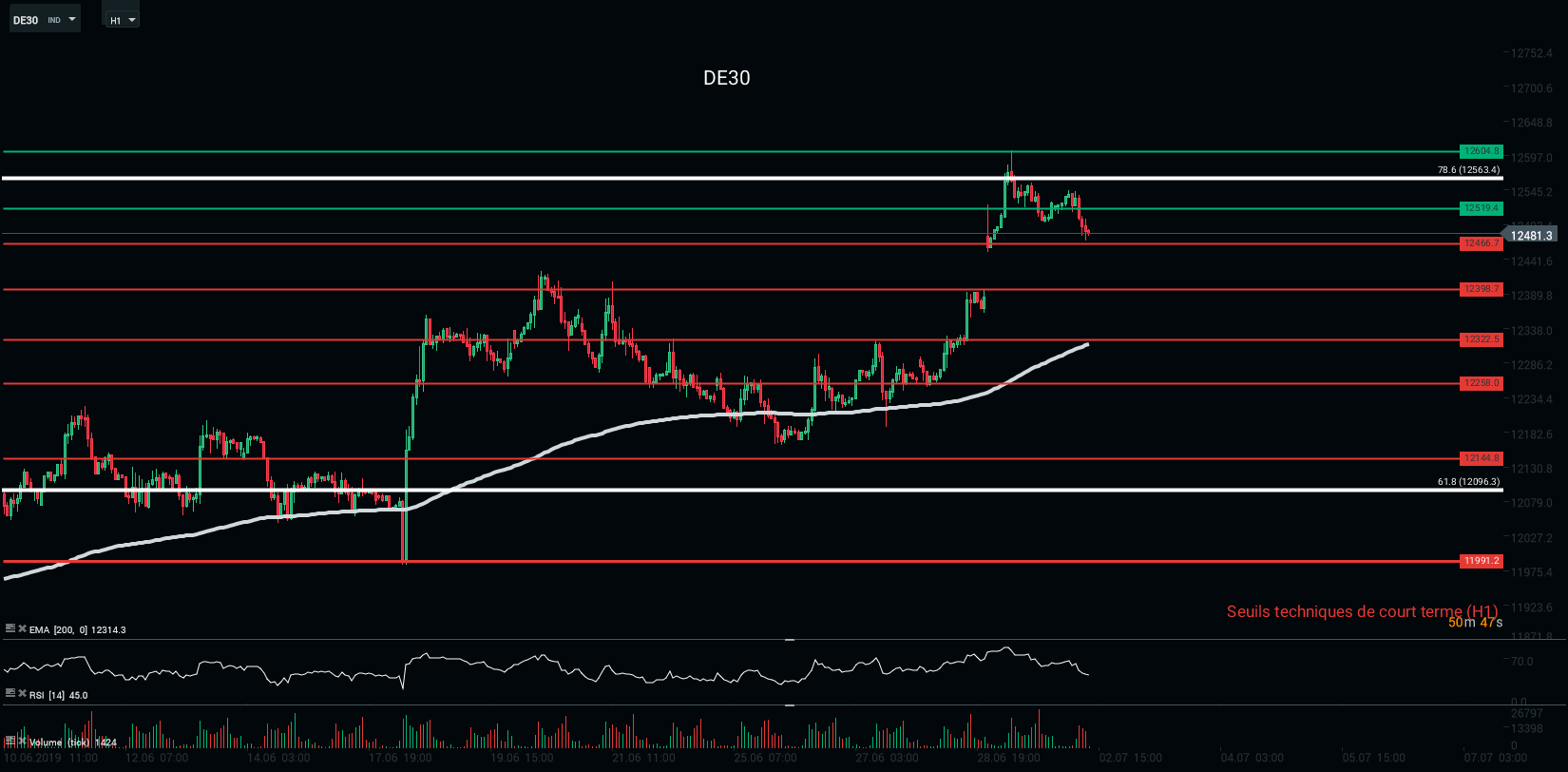 Pour l’heure, les haussiers ont été refoulés en matinée au niveau des 12 563 points (78,6 % des retracements de Fibonacci). Ces derniers essayent de s’appuyer sur les 12 482 points pour reprendre la main. Nul doute que les prochaines publications permettront de sonder l’humeur des marchés.